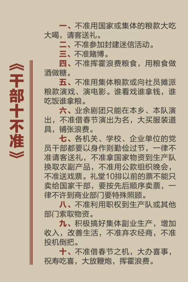 姥爺連夜起草了一份《干部十不準》:“不準任何干部特殊化,不準任何干部和他們的子弟“看白戲”……”以此作為警示。